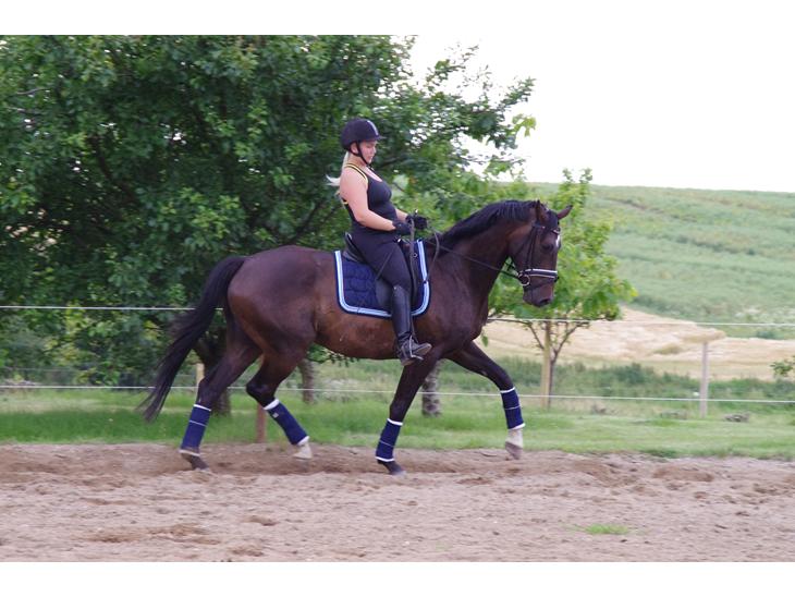Det går rigtig godt med Flügger, jeg har haft nogle problemer med at han har spændt meget op, og været meget urolig med hovedet, specielt meget, da jeg begynde at galopere på ham.