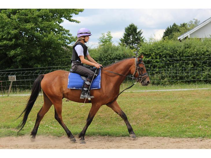 Galop: Middel: Når jeg rider, er han ikke den bedste til galop, men det er vi ved at forbygge. Men når jeg ikke sidder på ham, er han rimelig god til at galopere.