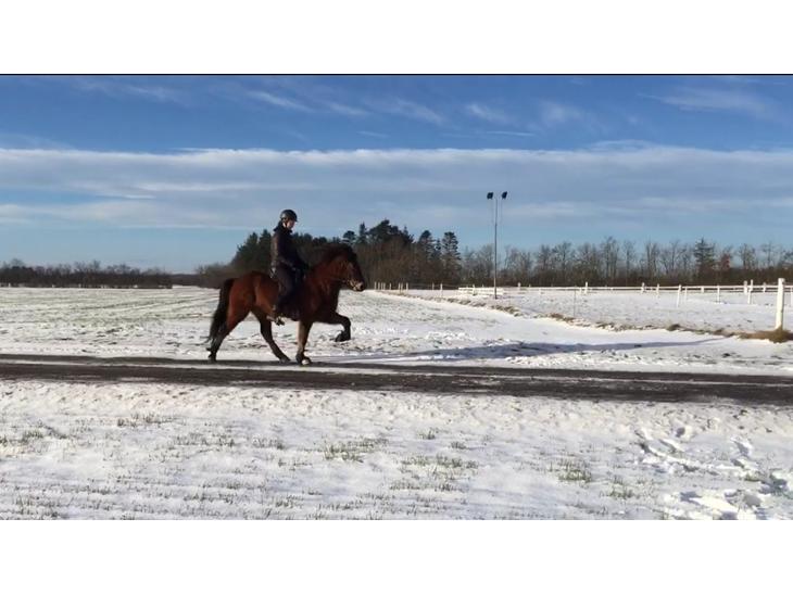 Han er 5 gænger og vælger selv tølten. Tølten er helt klart hans stærke side og med mere træning bliver den rigtig god. Han er en fin skridt og træder altid mellem 1-3 hove over sit eget spor.