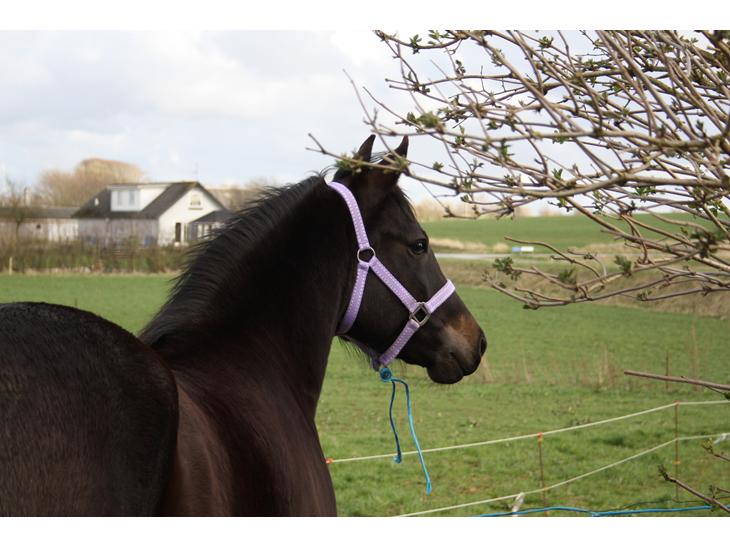 1. Maj 2016. Desire er nu faldet godt til i flokken, og der er kommet ro på igen, efter den første uges tid hvor tingene skulle falde på plads. Jeg har nu arbejdet med hende et par uger, og hun har lært at gå i longe, og kan adlyde et par stemmekommandoer. De første gange med sadel bukkede hun, men det er tilsyneladende ovre nu, så vi er snart klar til at få rytter på. Hun lystrer pænt til side og tilbage for let pres, og går pænt med over bomme og små kryds. Hun er meget nervefast af en unghest at være, men også samtidig en ivrig pony, der har mange forslag til hvad vi skal lave ;-)