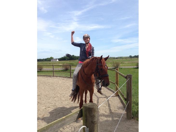 Indtil videre har jeg været på ryggen af Dut 5 gange, og kan selv styre ham rundt, selvom han synes det er mega svært! Jeg kan selv få ham i gang, og stoppe ham igen. Vi har redet mange volter i skridt uden sadel. Han er også blevet forskrækket med mig på ryggen, men han hoppede ikke engang til siden eller noget som helst.