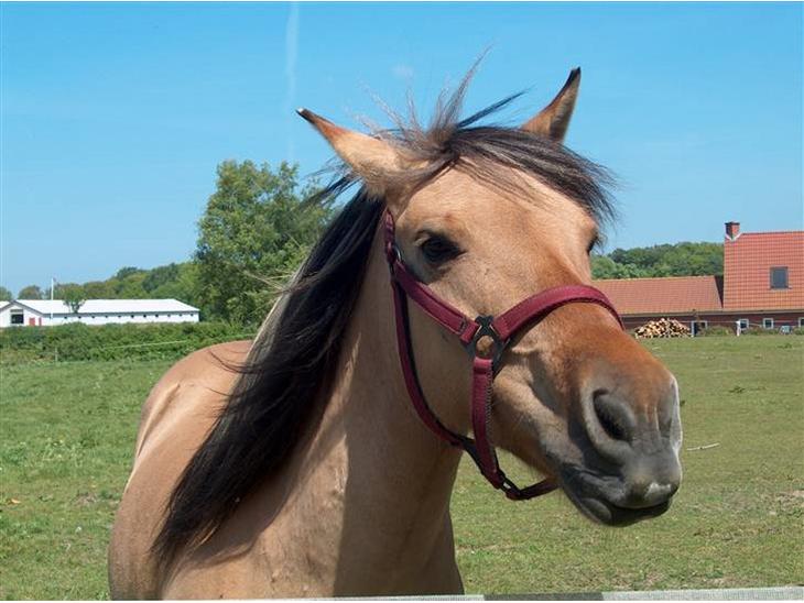 Hun er kraftigt bygget :] Kompakt lille dun farvet skønhed. Hun har ikk nogen aftegn. Men hun har sorte ben og trefarvede øre. Hun er helt speciel og der er ikk ret mange der kan ride hende.. hun er sin egen herre :D Hun er halv fjordhest og halv araber :)
