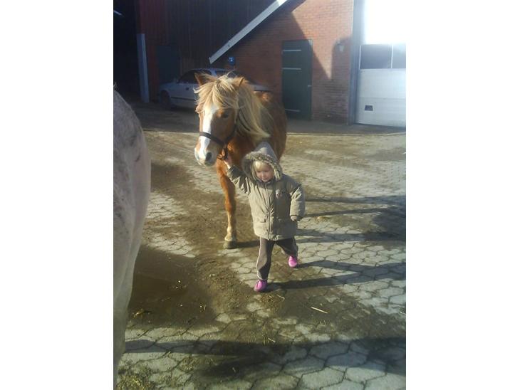 Dejlig pony på ca 14-15 år som gerne vil frem.. lidt for tyk ...meeen hun klare det fint med de ekstra kg selv om hun er på skrump..... min datter på 3 kan få lov til næsten alt .. hun går pænt med hende. men skal jeg gå med hende så sys hun det er sjovt at drille, løbe lidt til begge sider men meget nem at holde. dejlig dejlig pony......