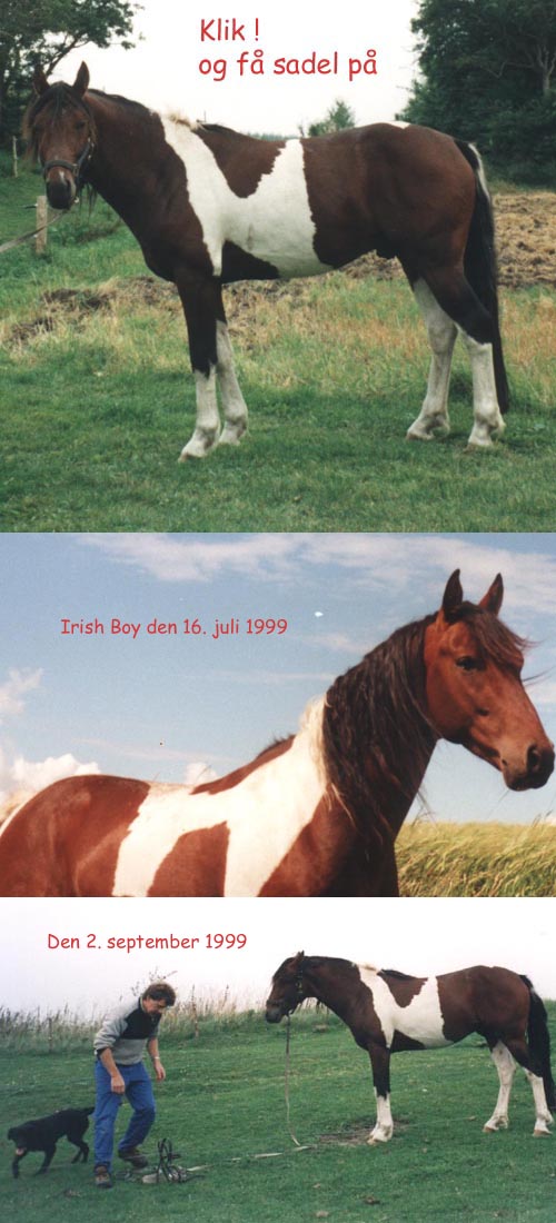 Irish Boy går og har et dejligt hingsteliv, håber jeg. Om vinteren går han i skel med andre heste og om sommeren får han besøg af dejlige hopper, som går på fold sammen med ham. Desværre bliver han ikke redet, og skal heller ikke lånes ud mere.