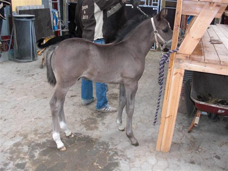 Da han blev født var han grå, nu er han så næsten hel grå sort, og han forventes sort brun, med 3 sokker.