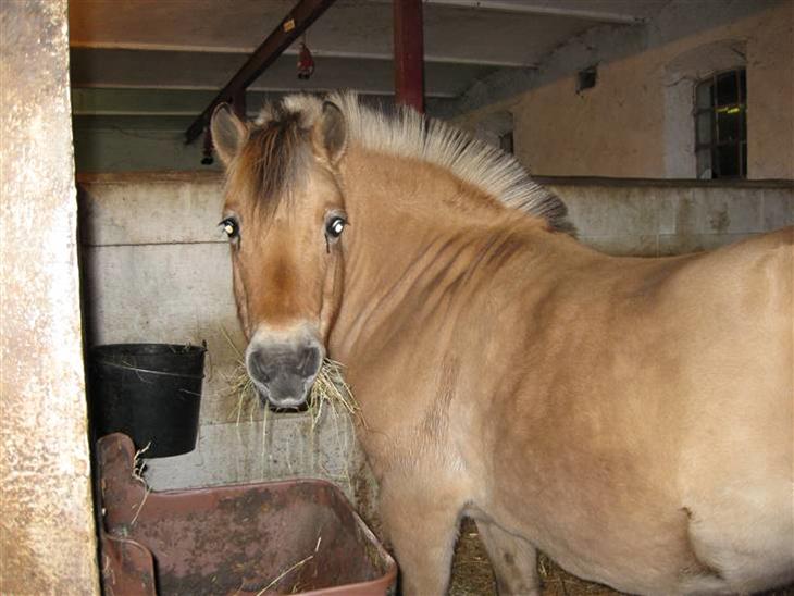 Hun er Fjordhest/Welsh Mountain. Hun er brunlig, sommer fed, ikke ret høj, og hun er utrolig sød og rar.