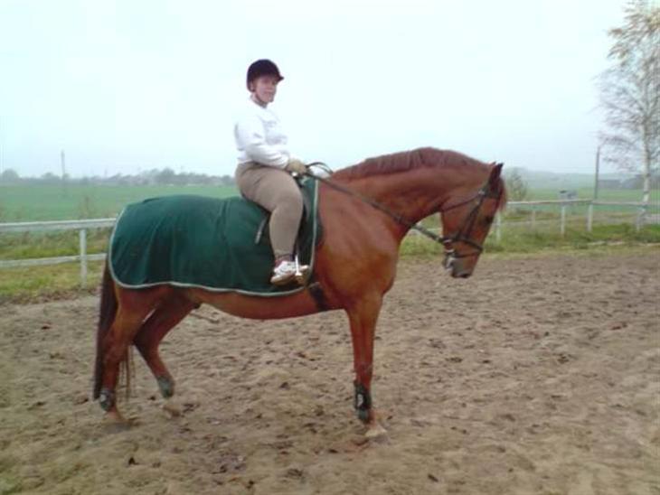 Junker er rød med blis og små hvide sokker.... Han har en lille hvid plet i sadellejet og hvide hår på forbenene, efter at have gået med gamascher på folden desværre (dyrlægens anvisning)....