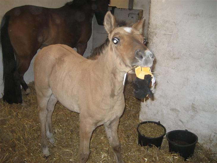 En rigtig bølle. Det er ikke uden grund vi kalder ham føllebøllen. Han har altid gang i et eller andet og altid det han ikke må :-D I Oktober brækkede han desværre hovbenet i den ene bagkode. Vi tror det er sket ved at han har sparket bagud i boksen. Han kom i hvert fald ind en aften fra fold og fejlede ikke noget og næste dag var han stokhalt. Først troede dyrlægerne at det var en forvridning, men efter 3 uger (og efter min mor skældte dyrlægen ud på telefonen) skete der endelig noget og han fik så endelig benet røngtenfotograferet. Først fik han ikke mange chancer for at overleve, men nu er han lige blevet røngtenfotograferet igen og bruddet er vokset fint sammen. I Januar må han komme ud igen. Han skal beholde sin specialsko på i lang tid endnu.