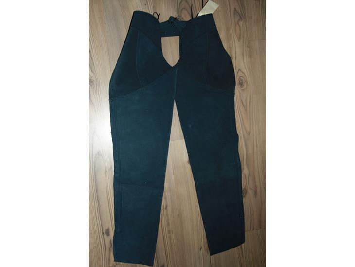 Helt nye chaps , Lækre chaps - varmer godt ;-), Helt nye mørkeblå chaps i ruskind/nappa med god lynlås i siderne og justerbare i liv. Benlængde indv. 81 cm med mulighed for at tage op til 10 cm af. Str. L