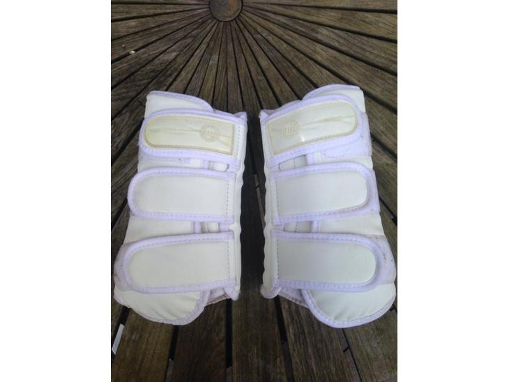 Hvide gamacher fra RBH, Hvide gamacher fra Rider By Horse sælges. De er kun brugt til stævner. Str. pony/cob (brugt på stor 1'er pony). Der er lidt slid på indersiden af bagbensgamacherne, ellers fejler sættet intet.