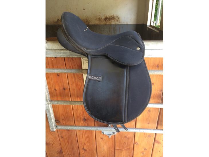Maxim pony sadel str 14". Brugt men fuld brugbar. Gjord og underlag kan følge med.