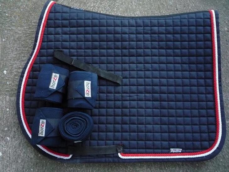 Equiline kombiunderlag 17" med blå kombinations bandager fleece/elastik fra horze, sælges.