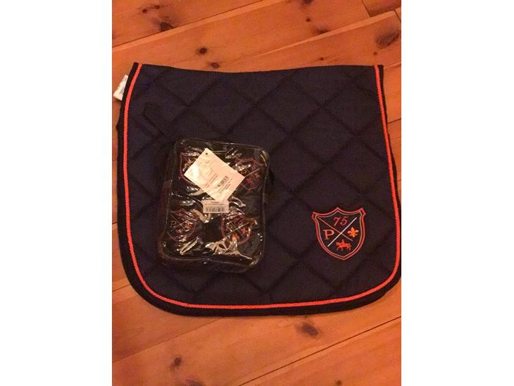 Helt nyt sæt, aldrig brugt. Dressur underlag 17" og bandager i fleece.