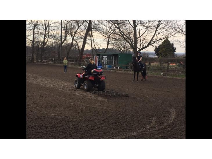 Vi har intet ridehus, men god bane der køres jævnligt og indgang til Dyrehaven lige rundt om hjørnet.