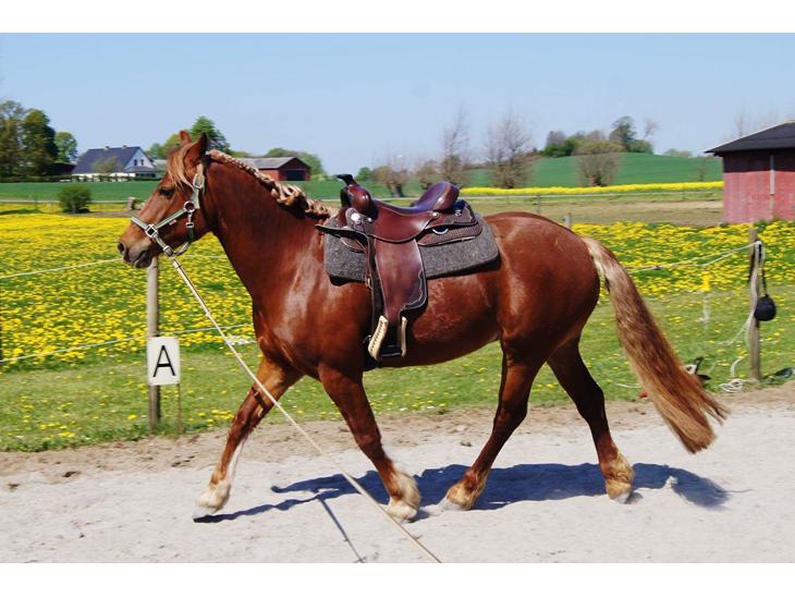 Hun er tilredet i skridt og trav, og kan galopanspring, men mangler balance. Hun er helt trafiksikker på tur med andre og går lige i trailer.